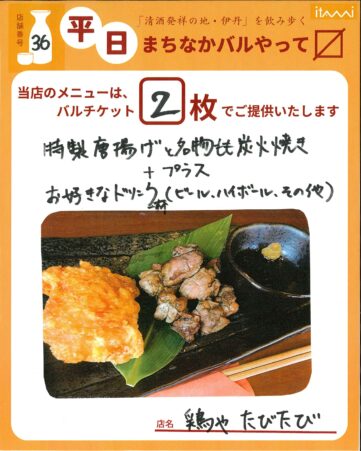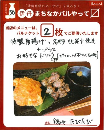 はじめまして!初参加の『鶏やたびたび』です。8月1日OPENの本格炭火焼鳥店です。是非バルメニューをご賞味下さい!