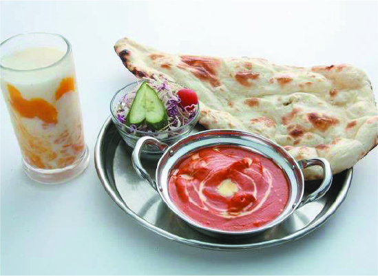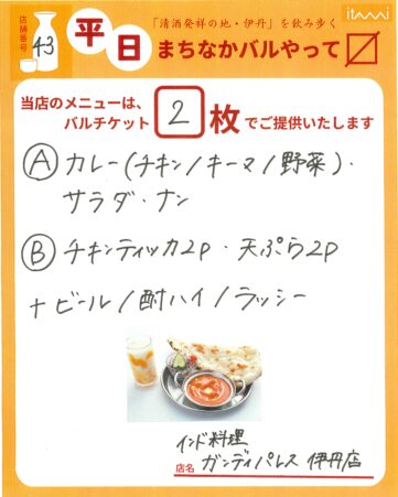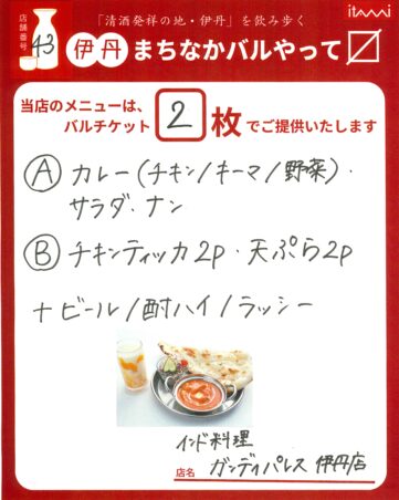 A:カレー(チキン/キーマ/野菜)・サラダ・ナン/B:チキンティッカ2p・天ぷら2p + ビール/酎ハイ/ラッシー
