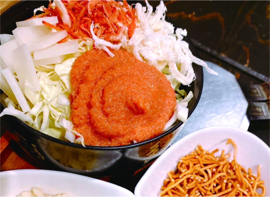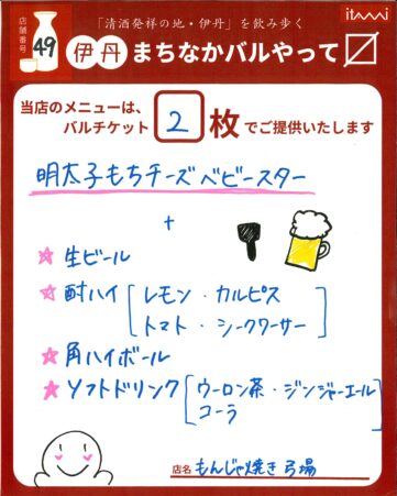 明太子もちチーズもんじゃにザクザクアクセント。ベビースターを加えた弓場の人気のメニュー。伊丹まちなかバルでぜひ。(限定100食)