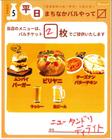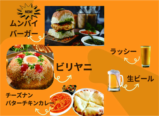 ムンバイ名物ハンバーガーとよ~いどんテレビで放送された本店のビリヤニをご用意いたします。もちろんバターチキンカレーチーズナンも提供いたします。