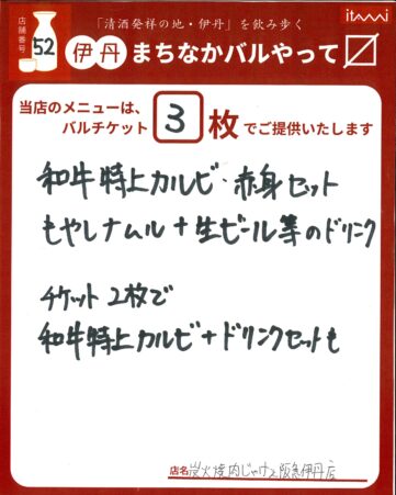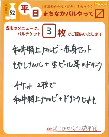 じゃけぇ人気の特上カルビと赤身の盛り合せ&もやしナムル。チケット2枚で特上カルビとドリンクセットも。(限定50食) 日曜バルは売り切れ次第終了。